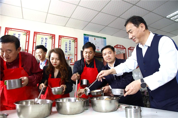 慰問演出結束后,“同心圓夢藝術團”文藝志愿者來到新崗村幸福食堂,為村里留守的孤寡老人和殘疾老人當起了“食堂服務員”,與老人們共同歡度佳節(jié);